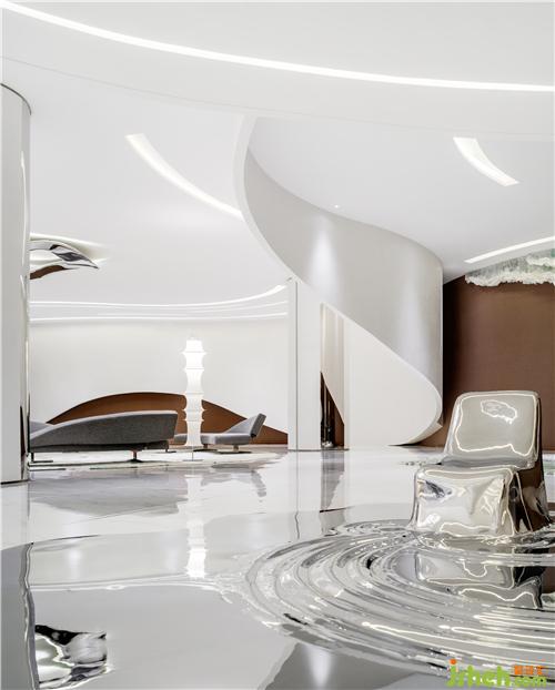 灯光侧嵌于楼梯外,如潮汐涌动粼粼波光忽隐忽现,又如江影月相之际,宇宙时空发生逆转,刚性的建筑与柔和的色彩迸发强大的空间气场,营造视觉上的动感。蜿蜒轻盈的线条流畅干净,白色外壁肃静单一,上下其间给予空间和访者最大的灵活性和包容性。枣红色内壁与银色金属台阶彼此交融,光线随时间与灯光变化莫测,呈现出宁静神秘的艺术质感,给予人们更多的情感力量。