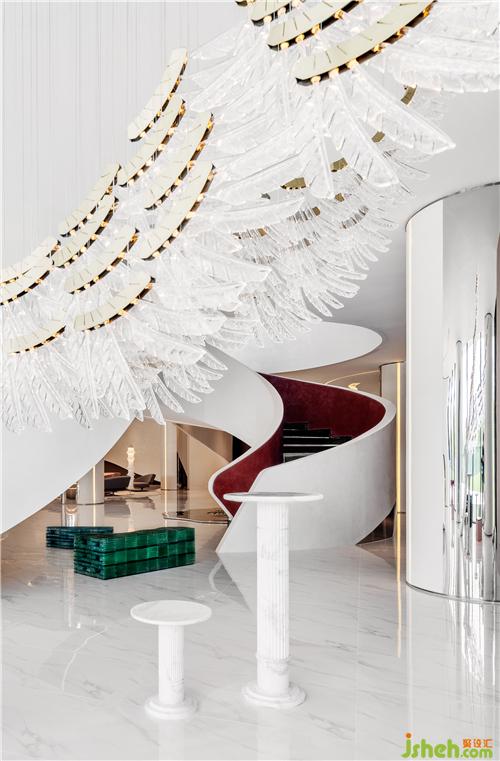 如水波般利落流畅的线条大气简练倾斜而下,为塑形空间凭添一份华丽,自然流露的艺术魅力恰到好处地演绎着自然与艺术的平衡。