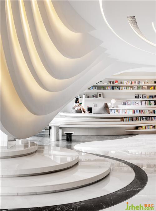 流线型的波纹设计如浪潮回涌铿锵击岸,水流涌动中,每一本书犹如浪潮翻滚而起的彩色砂砾,将文明的积淀一一冲向岸边,等待热情的理想主义者将其一一拾取。水吧、画廊等空间作为一站式艺文社交集合,酝酿着新的生活关系,这里既是日常交互场所、网红打卡点,也将是时尚艺术朝圣地。未来,人们可以在这里喝茶、会友、阅读、逛品展……随时调取生活的想象力,随时去往自己内心的星际。
