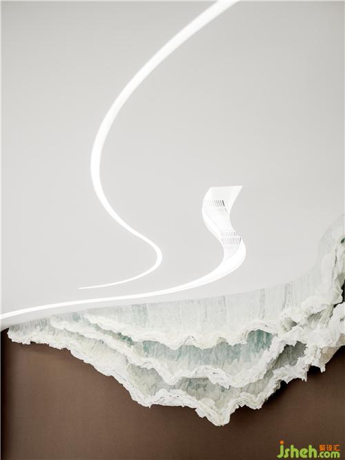 书吧区静处一隅,勾画出一个好似《冰河世纪》般巨大的冰川溶洞中新生的文明世界,又如《侏罗纪公园》模拟而成的远古地壳运动诞生物,宏大而遥远。沿墙体一侧自然剖开的流体空间,将每本关于文明的记载一一陈列期间,强化空间的虚实关系,似有似无间延伸空间纵深感。