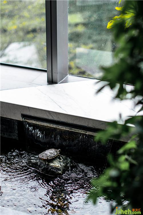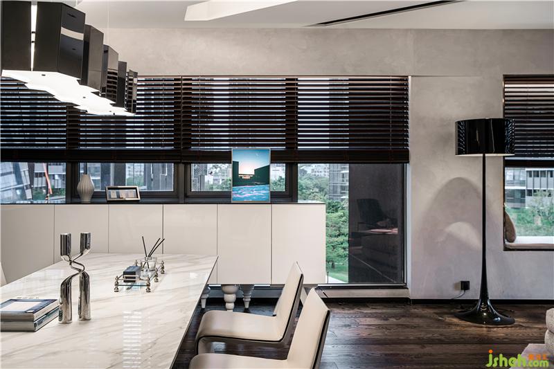 黑色的百叶窗水墨般静谧流淌,将盈盈的光、绿篱微动的景框入家的空间,光动如影,金色梦幻,绘出与天地融为一体的独特艺术品,就此成为最佳的佐餐风景线。