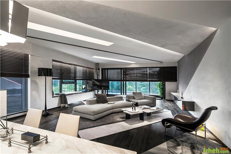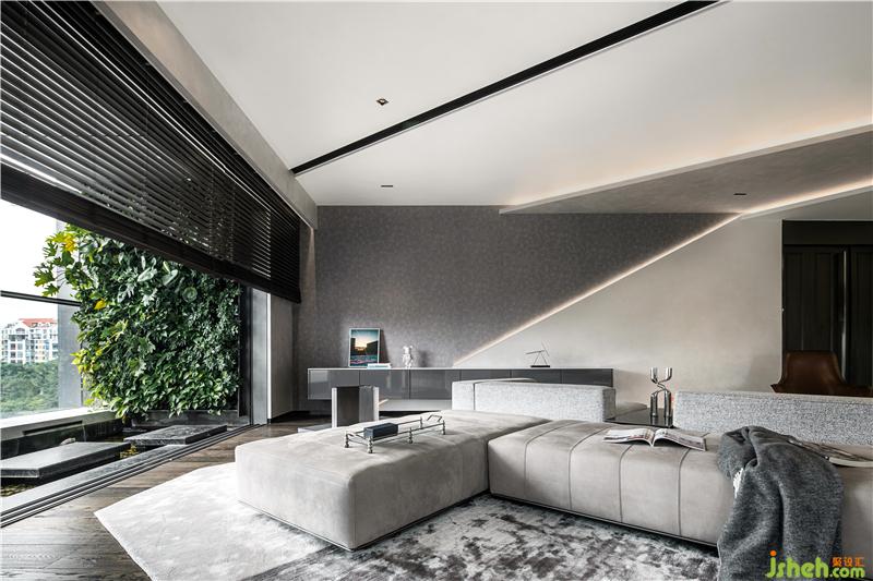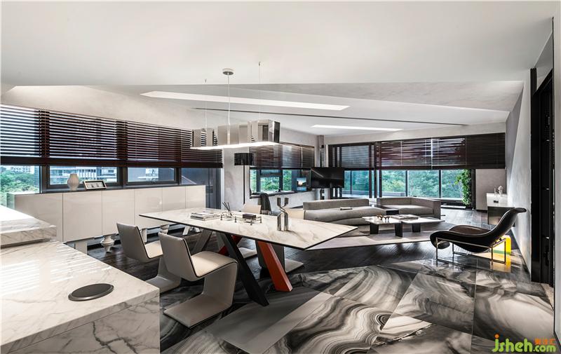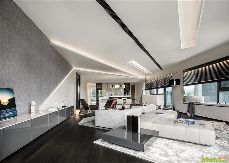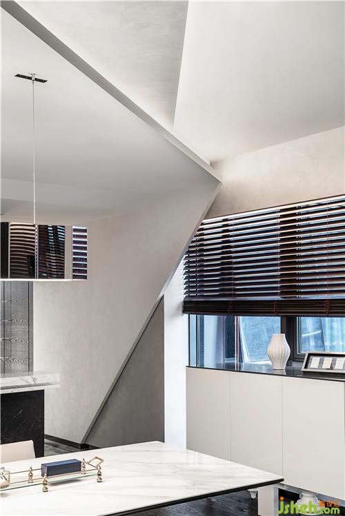 从容洒脱的折线从客厅天花板肆意延伸至此,犹如一幅旷世巨作于此完成最后一划,视觉上的和谐统一,为深圳豪宅设计展现的空间形态与环境尺度蕴藏微妙的平衡,生活形态与美学意识在此无形转化。