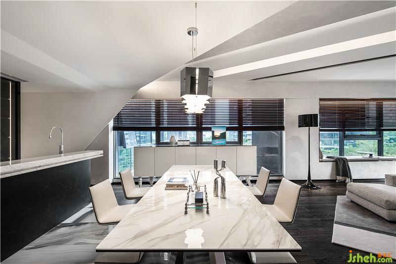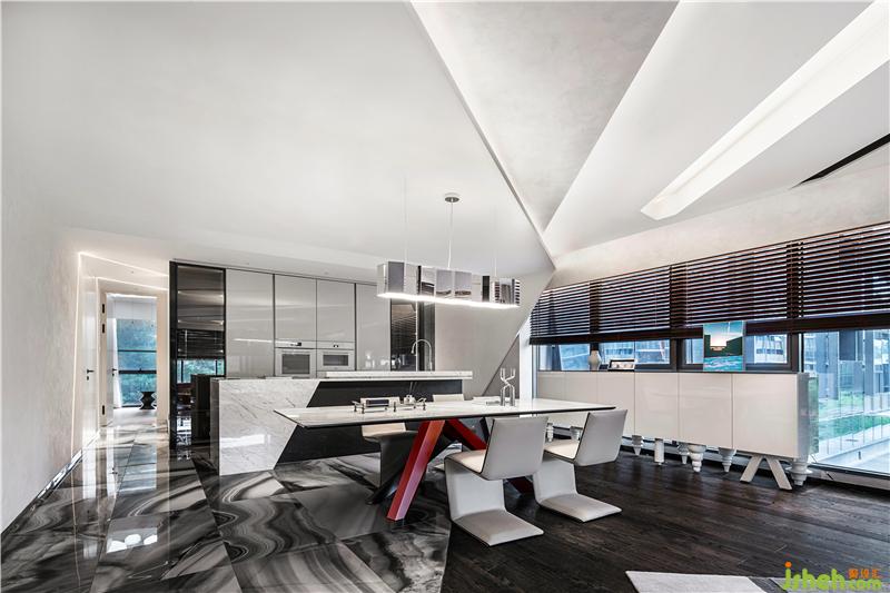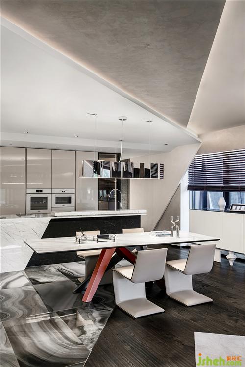 从地面、墙面、天花板延伸而来的线条形构的三维空间内,白色大理石悬浮感餐桌与3D科技感十足的灯饰,在柔和的光带组织和光影变幻下绵延出开阔的空间意境。
