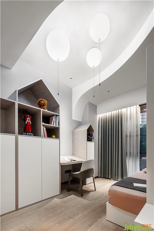 主卧黑白两色为主基调,间或以高级灰。欲望的克制在相融却不同的色系间涌动,横平竖直的塑形空间内,折线灵动跃入,似要穿透烟火鼎盛的平凡日常,抵达居住者内心的温柔港湾。