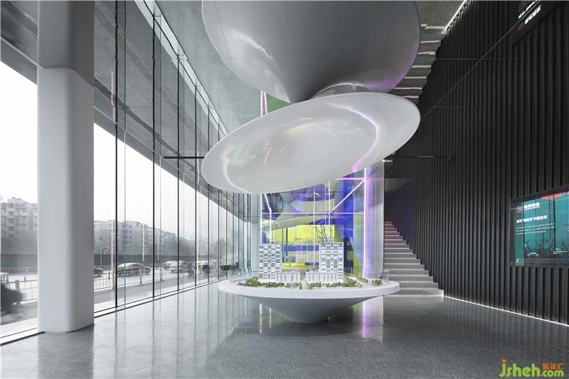 不规则地毯映画霓虹万丈、流光溢彩,柔软的质感辅之以科技感十足的城市光影,好似游走在繁华夜幕。游动、穿透、韵律相依存,极具层次的软装陈设,充满未来感的设计语言,勾勒出兼富节奏的立体空间,引领来访者的好奇心,直至抵达下一个空间情境杭州售楼处设计。