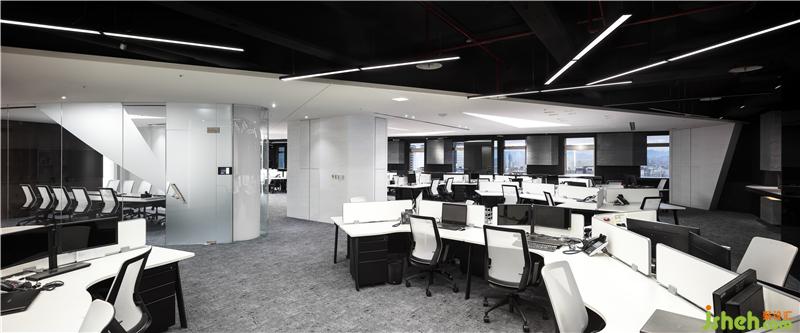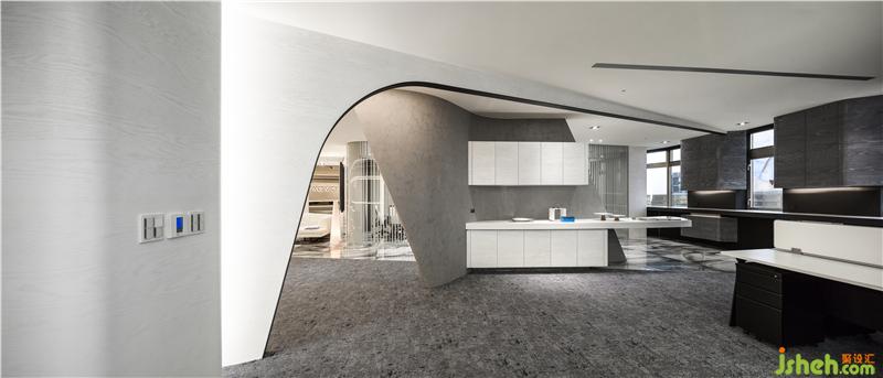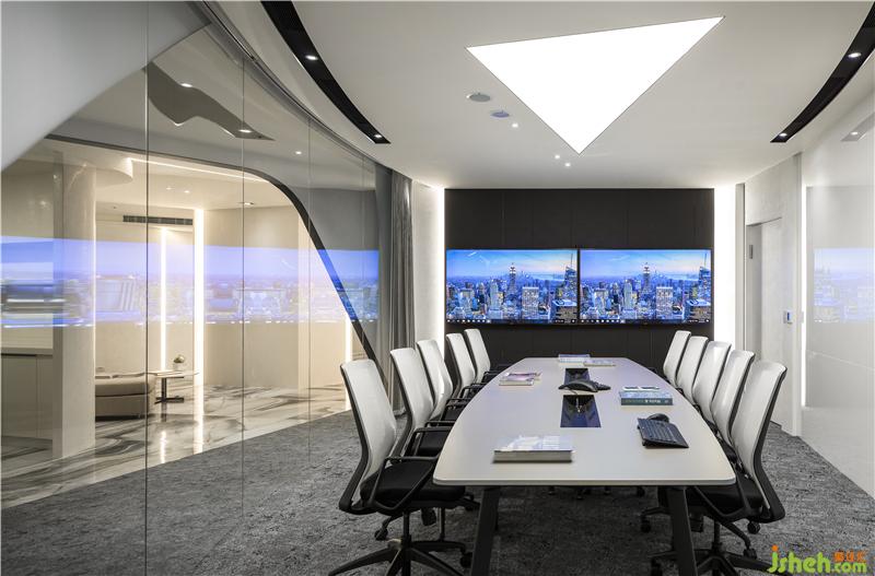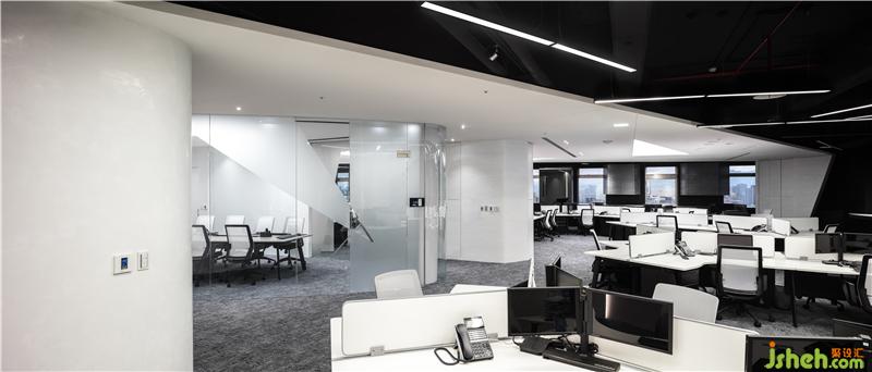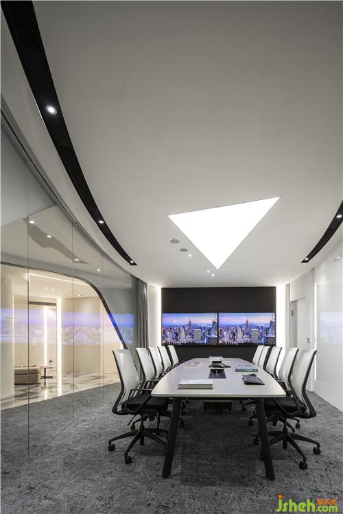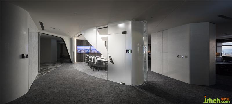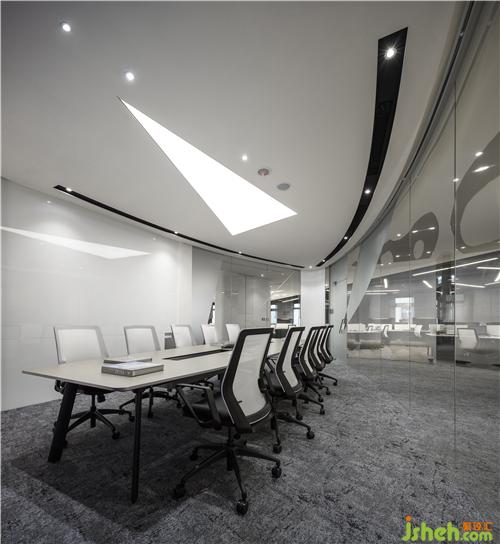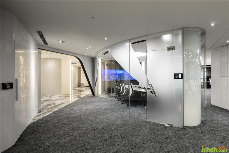 在有限的真实世界里营造出无限的空间感,一个虚拟的精神世界在几何造型的层层铺陈下徐徐展开。线条叠合、旋转,使空间进行组合,实现了场地平面细分和尺度控制,办公室设计将透明弧形玻璃围合的会议室安排在办公空间的心脏部位,使访客员工都能最快进入,形成了一个灵动而富于变化的“洄游式空间”。