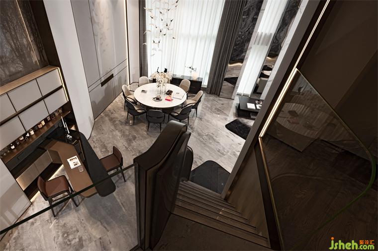 沉稳的灰、白、黑,柔和的橙与咖,革鞣饰面、金属、大理石、不锈钢交替形成层次,勾勒出细部质感,样板房设计为餐客氛围氤氲极致内敛的情调。