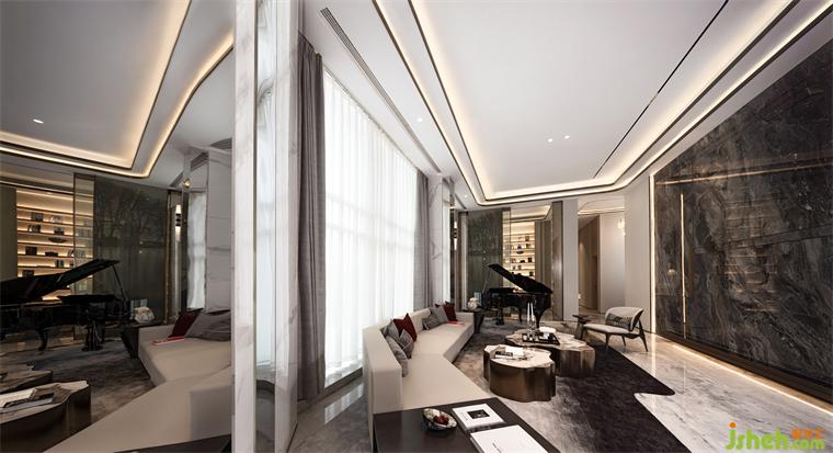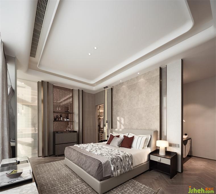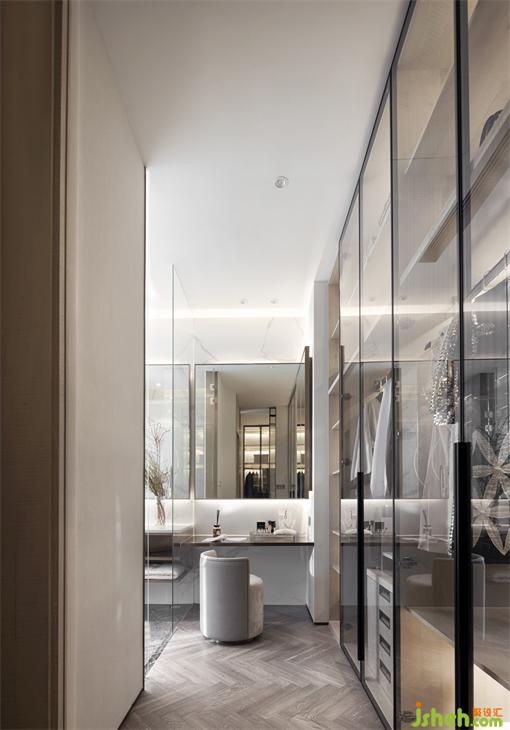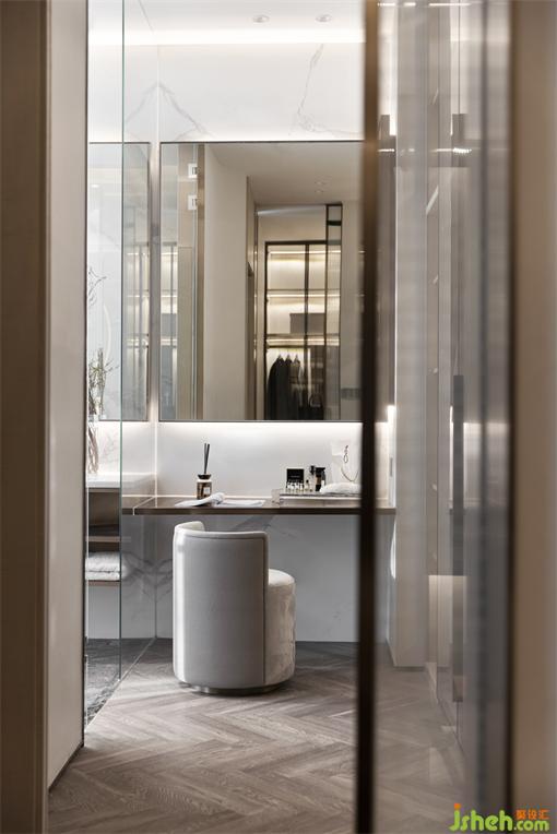 样板房设计未加过多装饰的墙画,将视线自然牵引至转角处。大地色的稳重与含有东方元素设计感的置物桌彼此呼应,一方一圆,为空间赋予戏剧性的魅力与诗意般的情境。