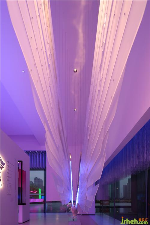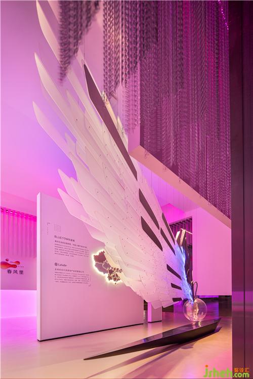 立于开端的艺术装置,仿佛是橱窗里最精致的那款宝石,一件由亚克力羽片、金属骨架与霓虹灯带组成的巨型之翼,生活馆设计仿佛游走于太空中的流光轨迹。