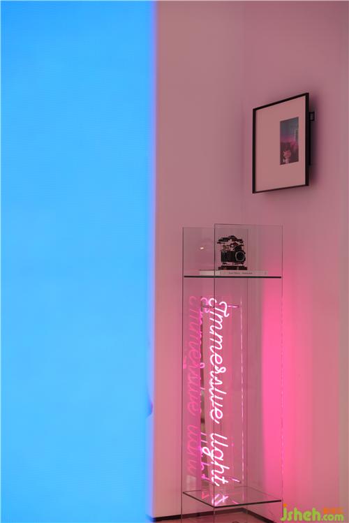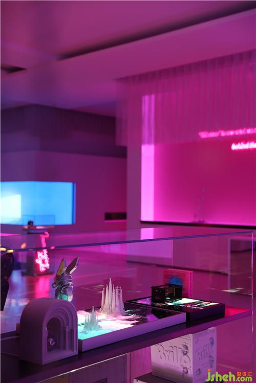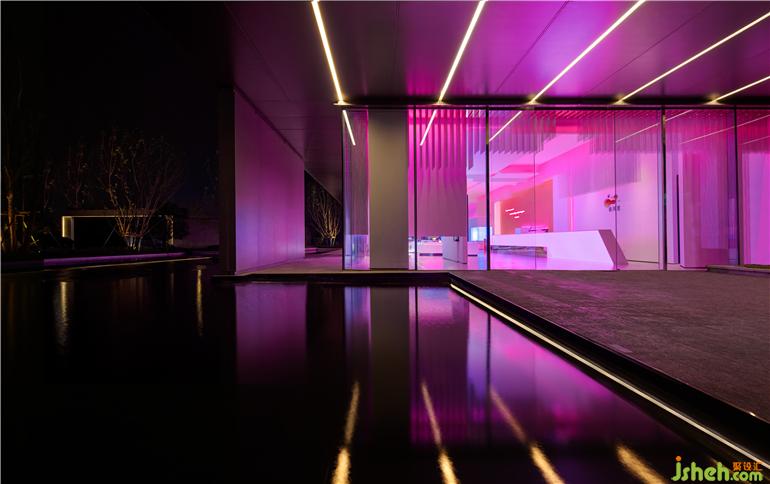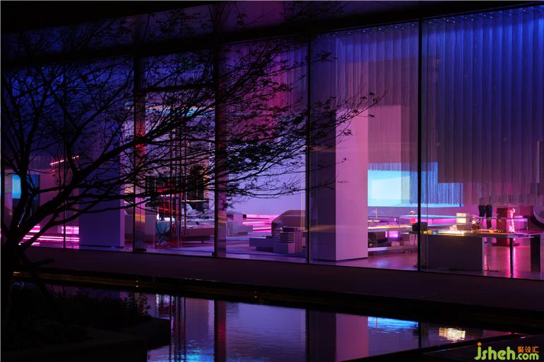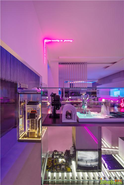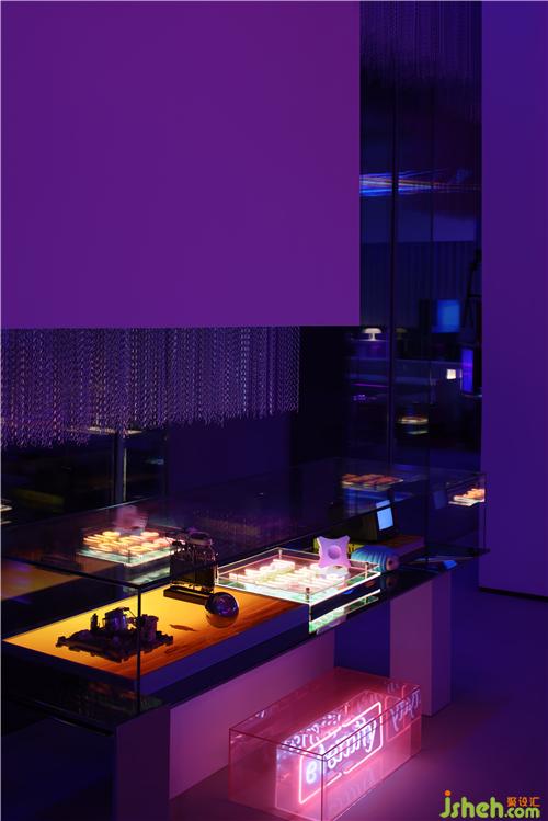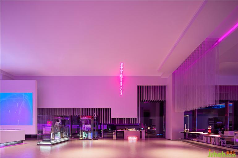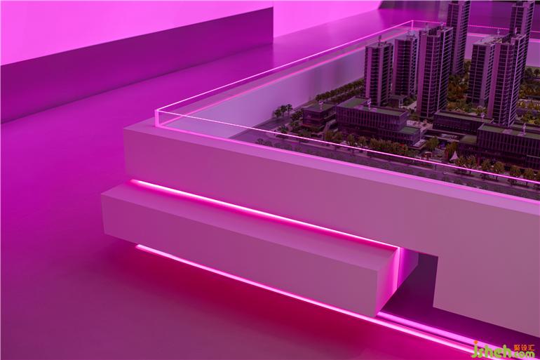 如果把空间看做是一张乐谱,那么光就是其韵律。霓虹灯带散发出的粉紫色的光,投影在亚克力与不锈钢结合的吧台是梦幻,生活馆设计投射于可升降的沙盘区域,则是艺术与科技的漫游。