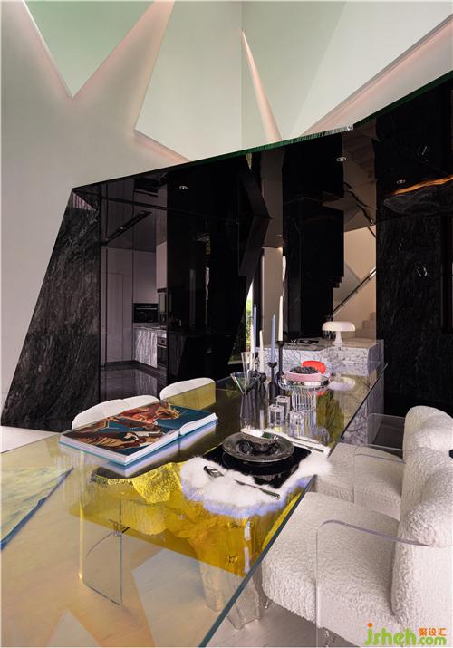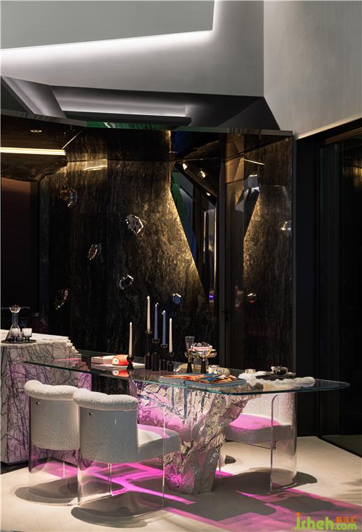 如果说客厅区是冰川、大海和极光,那餐厅区就是安宁避世的黑沙滩,黑色地面、深灰色墙面,秦皇岛样板房设计加上零散分布的剔透冰块,走近零度旷野的氛围感迎面而来。