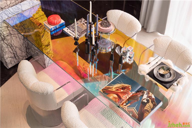温暖毛绒和透明质感亚克力组成艺术单椅,流光溢彩的琉璃餐桌悬浮在冰川之上,在这个神秘和探索的空间,就算一日三餐,也极尽梦幻浪漫。