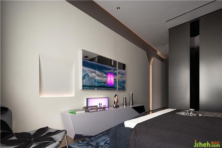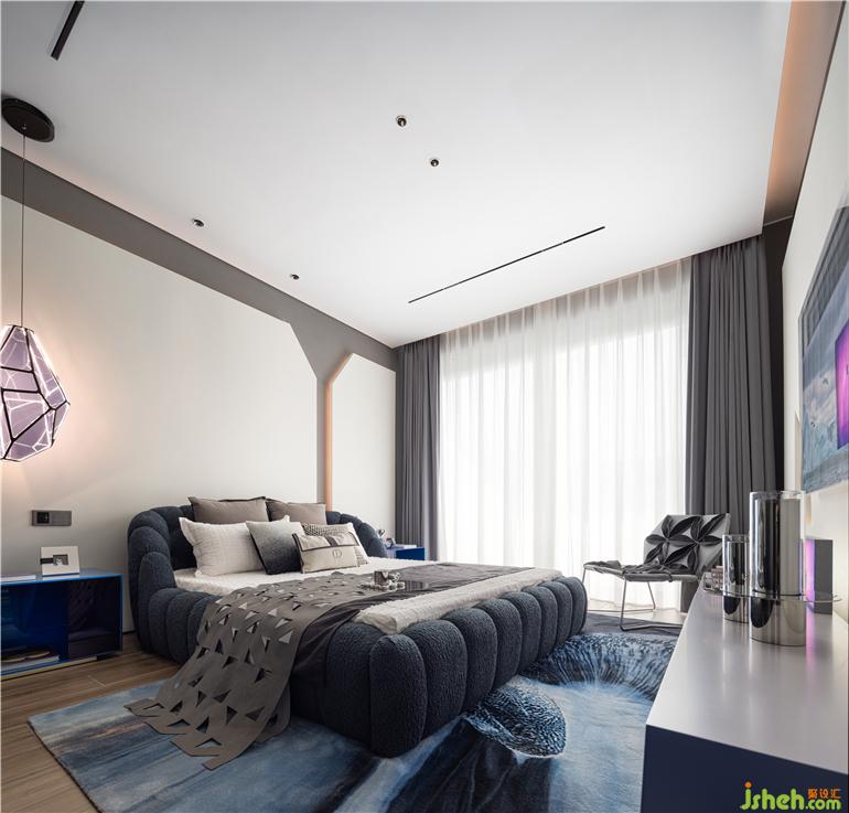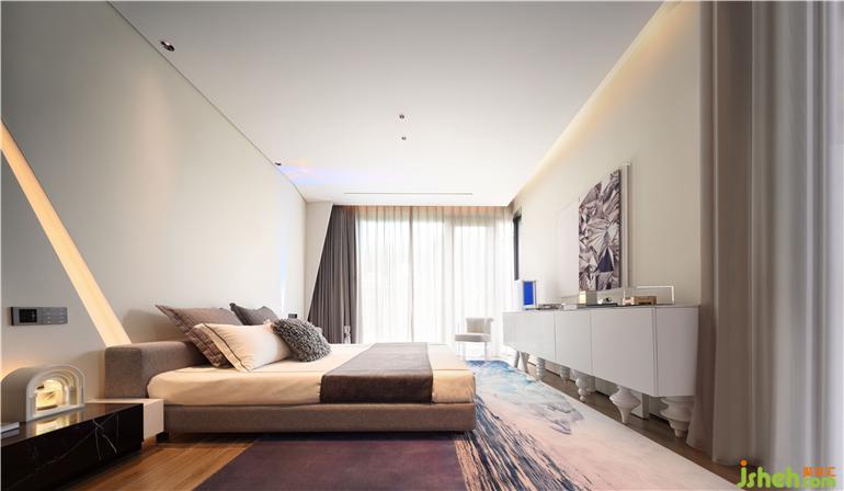 床头背景墙一道浅色人造石,点缀线条灯,凌厉线条带来切割的破碎美感。秦皇岛样板房设计渐变的极光装置、历经亿万年的蓝冰川地毯、璀璨冰层切割面装置画……虽然春天已来,却还是有冰雪仍未完全消融。