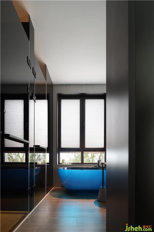 主卫延续主卧的蓝色,是更加浓郁纯净的克莱因蓝,蓝色透明、线条圆润的洁具,秦皇岛样板房设计像是扑面而来的天空和海洋,是格外强烈的视感冲击,明净空旷使人迷失其中。