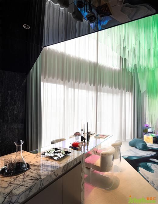 蓝冰块灯具清冷神秘,极光地毯视觉夸张,亿万年冰场装饰画让人一眼冷静自制,冰川、大海和极光元素始终贯穿在空间中。秦皇岛样板房设计作为身体和意识的延伸,一款甄选床和床品尤显珍贵,温暖质感的北欧面料,既包裹人的舒适性, 又传达出优雅的气息。生活的温度,总是融在这样那样,每个可触碰的细节里。