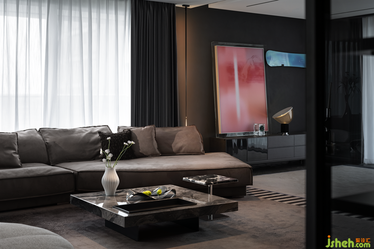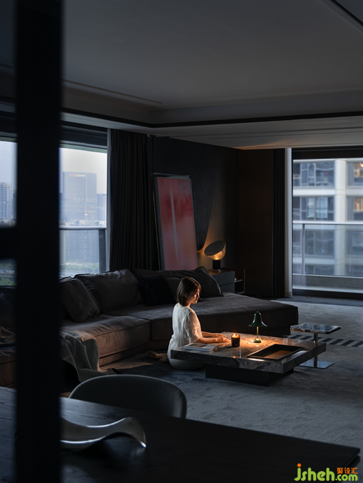 由于硬装的留白,加上壹号院的无敌采光,230㎡的大平层,每个空间尺度也足够大。所以在软装阶段,可以大胆地将曼哈顿灰的偏爱发挥到极致。