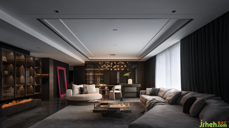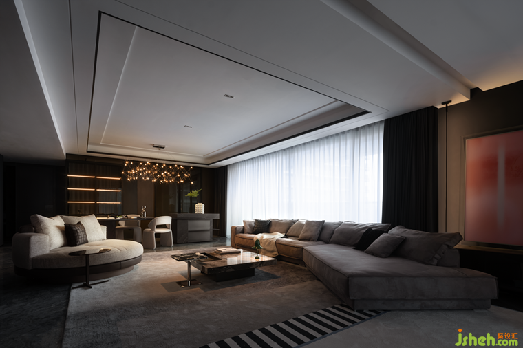 作为白色天花板与黑色地板之间的优雅过渡,客厅的沙发巧妙地选用了不同程度的灰色系。豪宅设计同色系地毯的点缀,不仅增强了空间的层次感,还为整个空间增添了一份宁静与和谐。