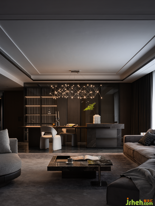 空间应该让人们感到生命的美好和力量,宽敞通透的客餐厅,使得整个空间更加流畅,为空间带来更多的自由和开放感。黑灰色调大理石中岛餐桌搭配灰白色餐椅,营造出深邃而极简的空间氛围。