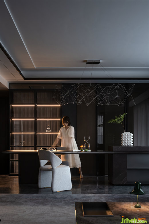 餐厅上方的不规则星星灯,宛如悬浮的艺术品,晶莹剔透,为用餐时光增添一抹无比动人的诗意,黑色也散发出温柔的底色。