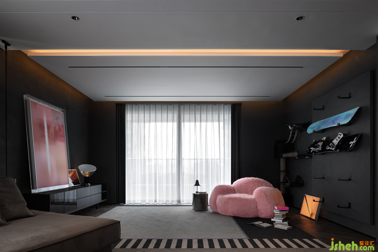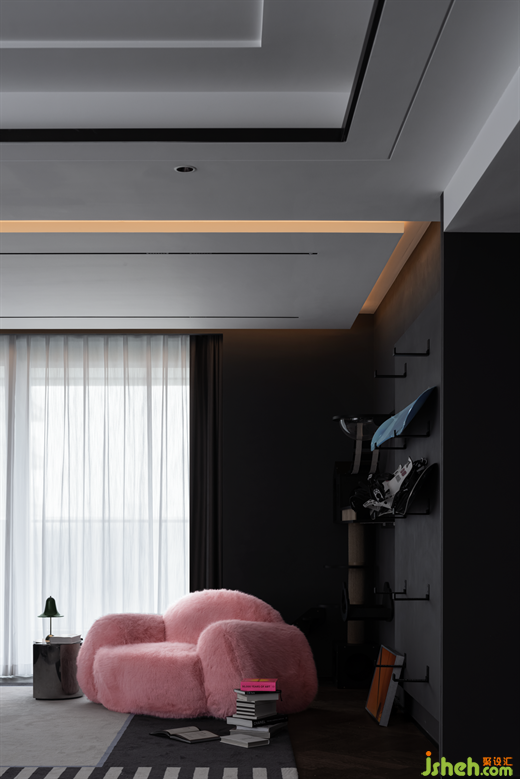 粉红软糯的毛毛沙发,是这个灰色空间里一道温柔明亮的光,柔软舒适的坐感,与空间形成反差,增添空间透气感的同时,也充满了满满的少女心。