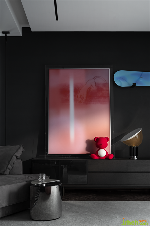 全屋都是暗色最大的弊端就是沉闷无趣,因此设计师通过多种材质、肌理的碰撞,金属、皮革、玻璃、布艺……让黑色表达的更有意味。