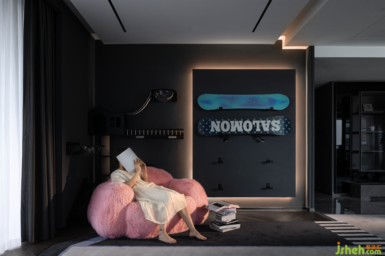 重要的是,设计师还巧妙地为这位热爱滑雪的女冒险家,豪宅设计了一面滑雪板展示墙,用来展示她从世界各地搜集来的滑雪板们。展示墙旁边的猫爬架,为猫猫狗狗提供了一个玩耍和休息的天堂。展示墙和猫爬架不仅实用,更与整个空间的现代风格相得益彰,展示了Mia对生活的热爱和对品质的追求。