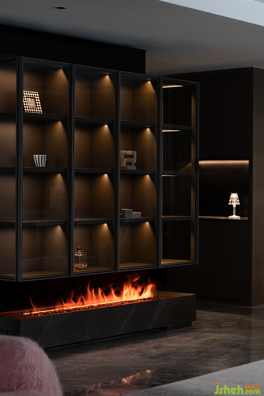 火焰的明亮与周围的深色调形成了鲜明的对比,更加突出了壁炉的存在感。