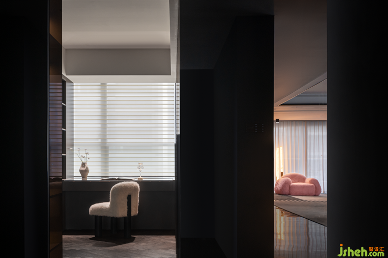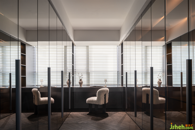 半透黑玻材质打造的衣帽间,大气又时尚,仿佛一座充满现代气息的玻璃宫殿。宽敞明亮的化妆台正对窗户,窗外的景色与室内的黑玻相映成趣,营造出一种既私密又通透的舒适氛围,也完美诠释了年轻业主的独特品味与对生活的热爱。