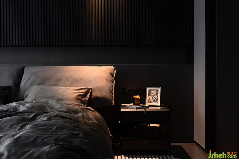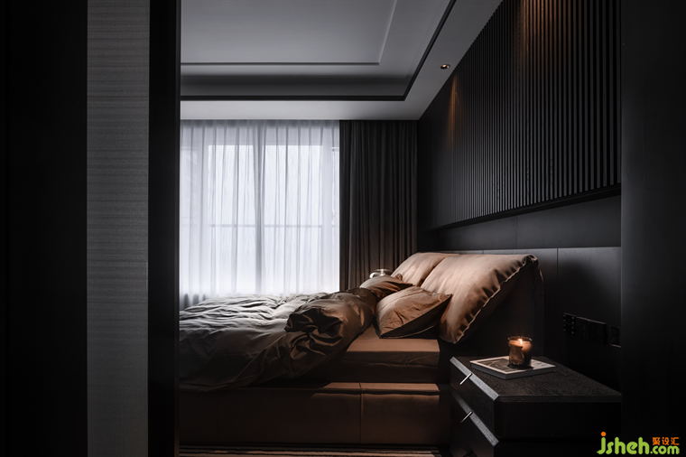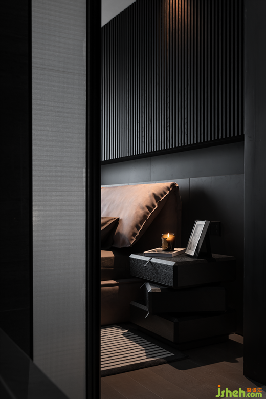 豪宅设计主卧将黑灰色贯穿到底,甚至床品和地毯也坚持选择了深色,却意外带来静谧感,让人进入空间不自觉安静下来,更好地进入休息状态。