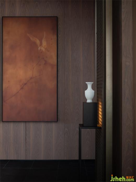 生活馆设计空间中,艺术or藏品无处不在,一楼走廊尽头这幅画,亦是刘荣禄先生研发创作,灵感来源李白的诗句“野竹攒石生,含烟映江岛”,用绢布叠影手法来讲述竹影顽石映照在余晖江水上的意境,端景玉台和琉璃器打造氛围感,增强仪式感。