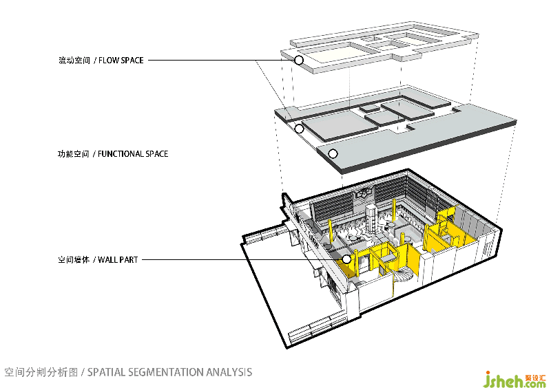 项目开始,现场柱子林立,特别是空间中心的巨大承重柱,显得格外显眼。这也成为本次设计的最大难点。我们将空间中最大的障碍“主承重柱”通过旋转、分解与重组,形成场地的视觉中心,并最终将其演变成场中的“精神堡垒”。其它柱子则用黑色镜面不锈钢进行包裹,通过镜面反射将其“隐身”。