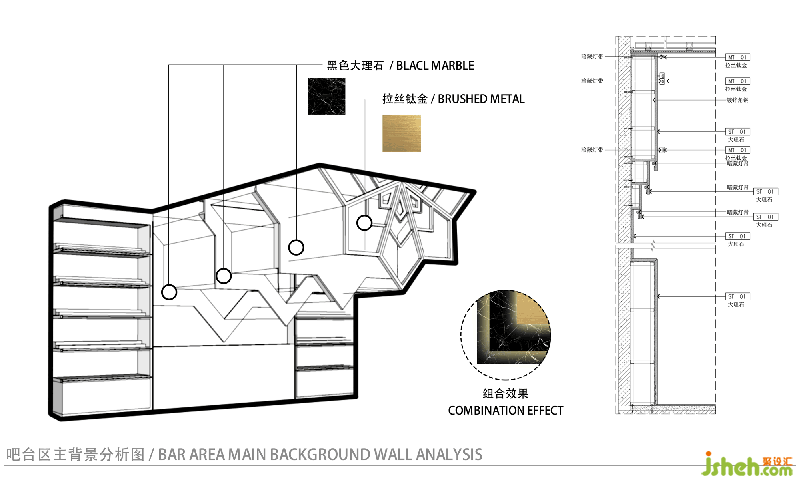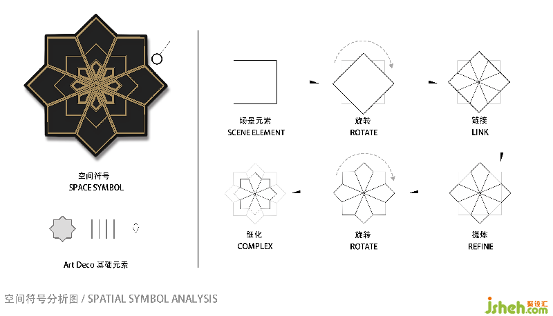 在设计过程中,我们以场地的结构为基础,进行设计与演变,营造出”镜花“的雏形。通过单一元素的复叠与衍生并配合金属色和对比色的巧妙使用,使场地产生具有独深圳酒吧设计特ART DECO风格的文化符号。空间布局则是基于场地的基础功能以及现场的特殊结构来展开设计和思考。