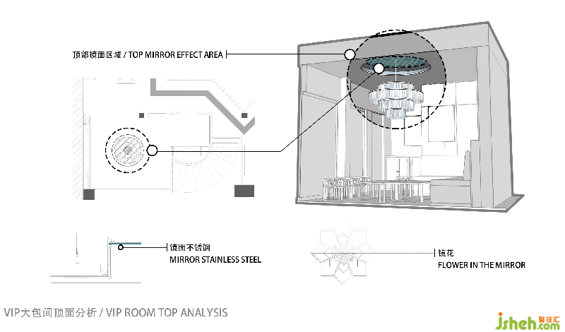 本次设计以“镜”为题,在包房的设计过程中,将包房的主要墙面与顶面进行镜面处理,从而实现“镜借”的效果。不仅如此,包房是属于较为私密的空间,在”境借“的设计过程中,为了实现更合理的反射效果,设计中通过不同的材质,来控制镜面的反射程度。