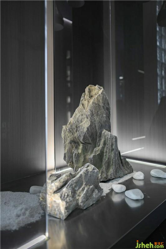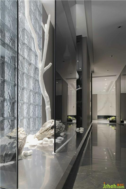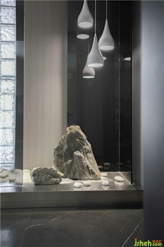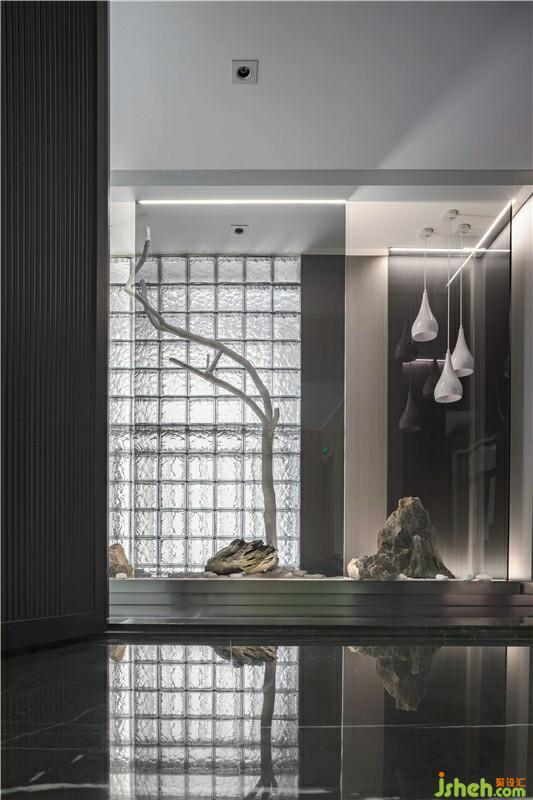 玄关处把自然的艺术用不同材质来体现,利用黑色玻璃砖,如黑夜里的水纹一样波澜,在灯光下又显得闪闪发亮。角落里的的艺术盆栽,两盏吊灯如水滴一般,整体空间是呈现现代美感。
