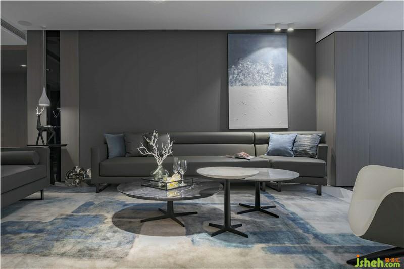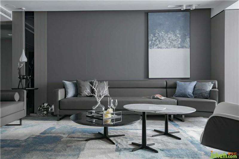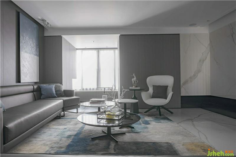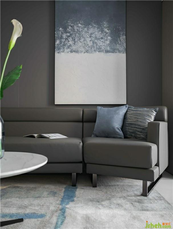 客厅空间整体视觉是现代简约,大理石背景墙的温润内敛搭配木质的木质感;灰色沙发颜色呼应空间整体色调;蓝色抱枕与蓝色海浪装饰画:浪拍打激起层层浪花,给空间带来勃勃生机,色觉跳跃活泼;利用简单的线条,带来视野的空阔感,空间干净利落,具现大气、个性、简约。