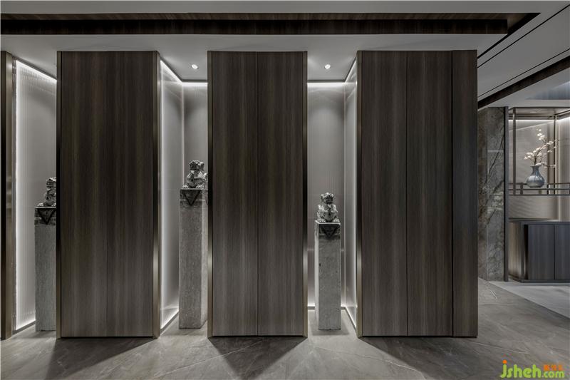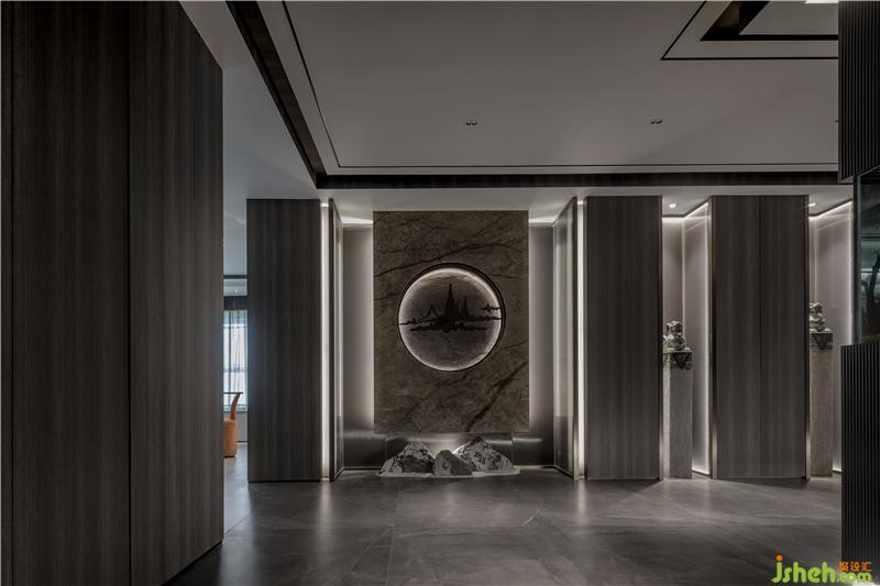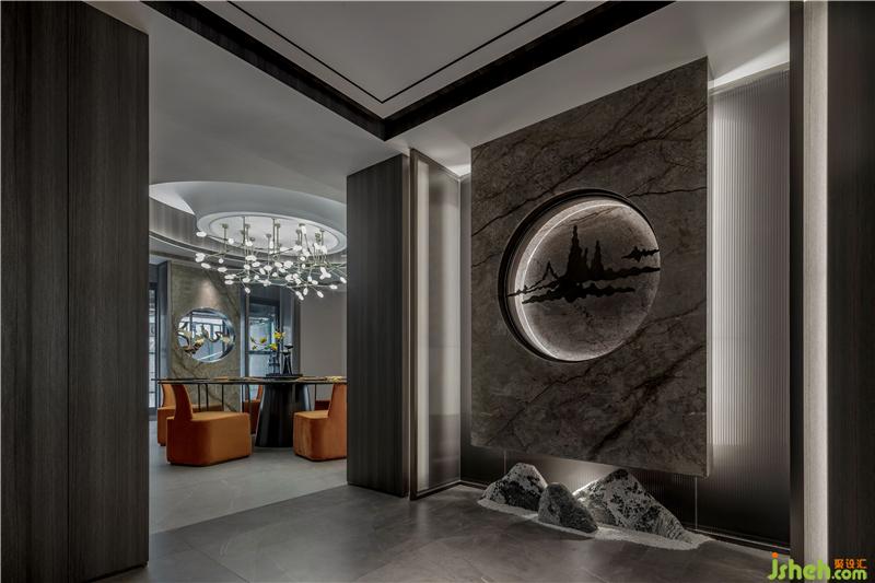 “隐”屏风的圆形花窗宛如一轮明月,半遮半透,不一样的玄空造景设计,可谓别出心裁。如山如月如云, 在形、境、韵的层次上进行感官的叠加。