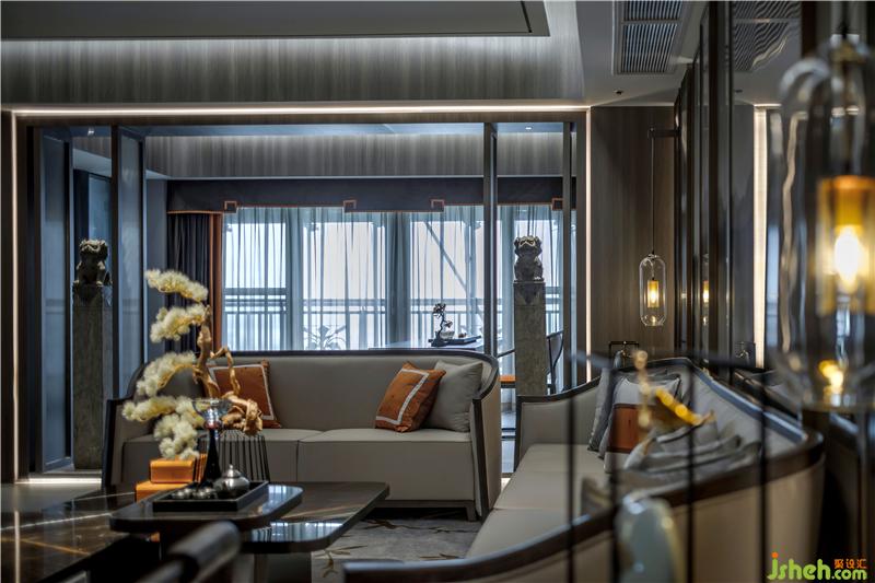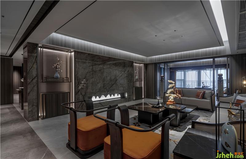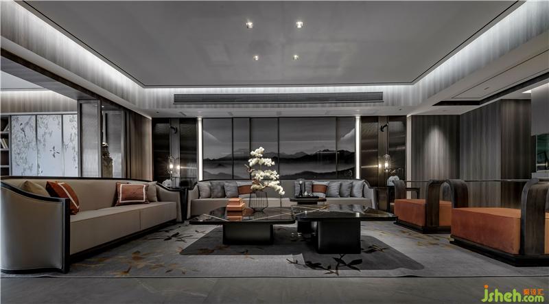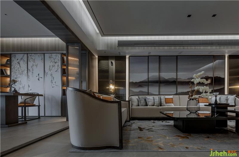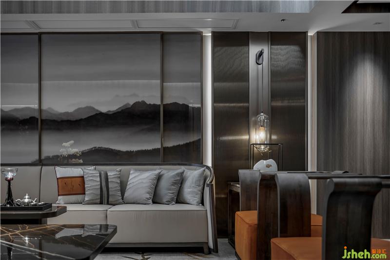 “墨”客厅回归空间自然质朴的天性,沉静清淡的色彩,让整个空间的氛围有着中国浓浓水墨之感。透最本质的材料把中国的朦胧水墨之美呈现。