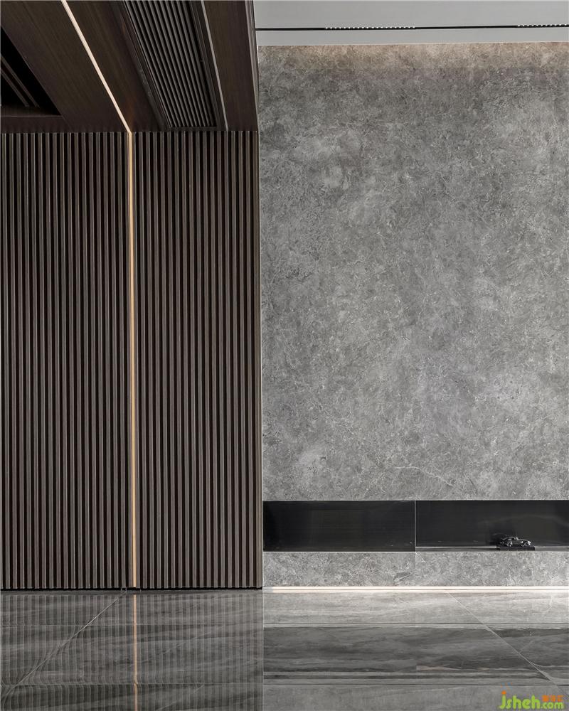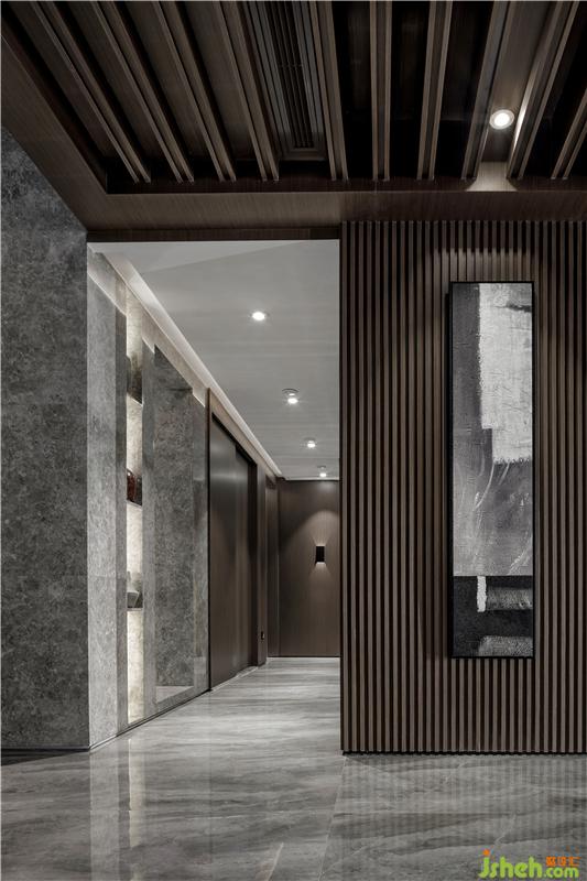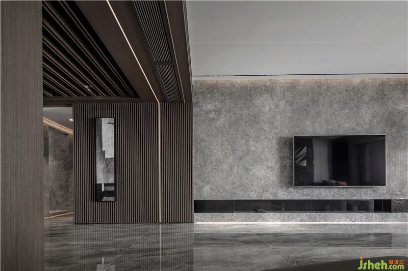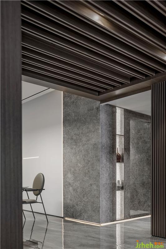 过道设计利用木的切割、线条灯的设计让客厅和餐厅做了一个合理的分割,充满现代感和穿越感,里应外合,营造出线条的美感;营造出来的空间序列,视线的通透、封闭、半通透也在这个过程中被精心的安排;进入这里,会有不同的空间感受。