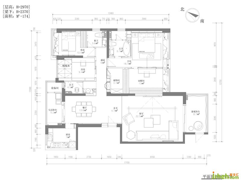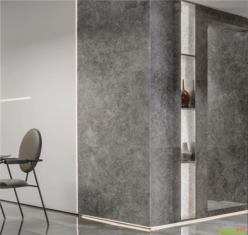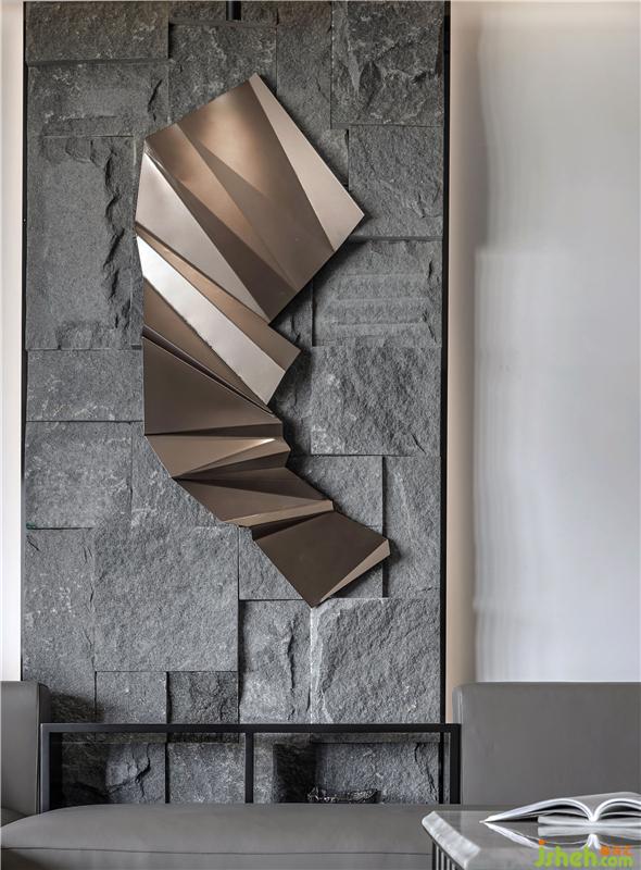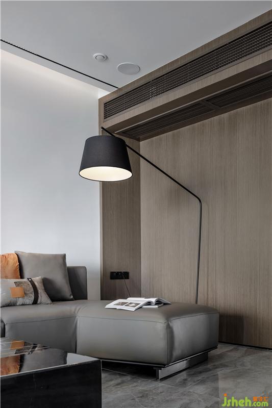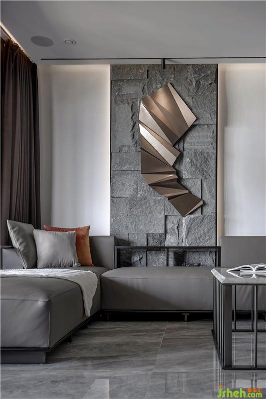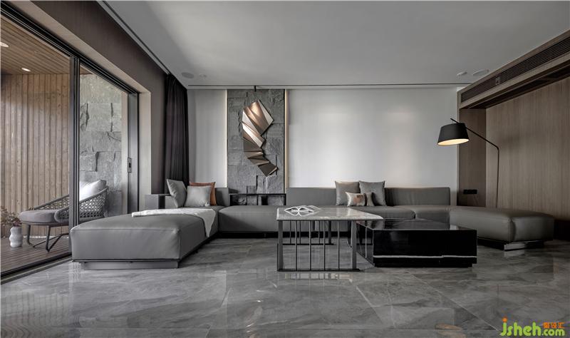 本案中,室内设计师采用灰色为主色调,没有多余繁琐的设计,而是利用开放式设计,利用简单的线条,灰色调的大理石电视背景墙,地板为浅灰色的大理石瓷砖使空间一眼望去干净利落,带来视野的空阔感。在灯光方面利用藏灯而没有繁琐的吊灯,使得空间更加通透。室内设计师在软装方面搭配几何设计,淡淡黄色的点缀,视觉效果强烈,使空间个性鲜明。
