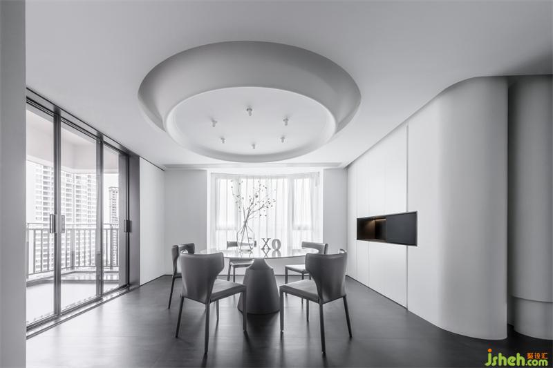 圆形吊顶藏灯与大理石餐桌照相辉映,