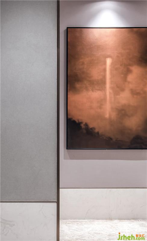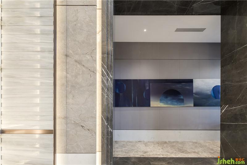 空间走道定制的挂画回应着设计线条的语汇抽象挂画,新奇而独特,构建一幕幕充满想象艺术的场景。深色却纯净,局部点缀优雅的宝蓝、暗黑,营造出了一个戏剧化开放式空间,穹顶之上,群星闪烁,日月有常,星辰有行。世事虽流转,光华却万千。