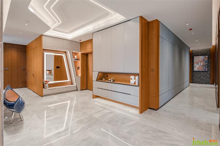 样板房设计以空间的气质来揣度居者的品位,入户玄关深色木与浅杏色饰面搭配相得益彰给空间带来沉稳的高贵气息。几何线条流线造型的换鞋区和天花造型上下呼应,结合明确的比例,优美的线条和经典的细节,增加了空间的趣味性的同时也具有收纳的实用性。