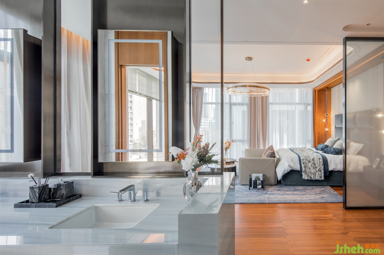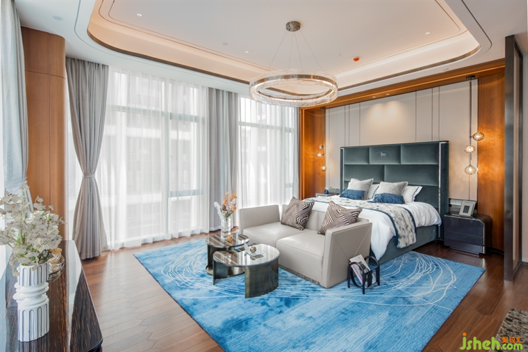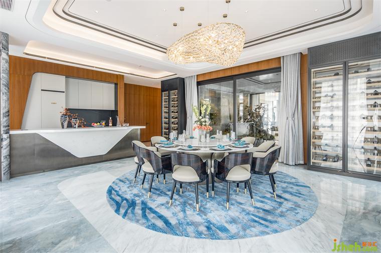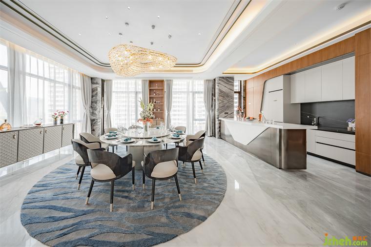 餐厅和西厨用了一体化的设计,样板房设计让空间的动线更加的显而易见,中岛台设计满足了一个西厨更高形式的功能需求。软装在面料、材质及色彩上与硬装整体调性相呼应,陈设无过渡堆积元素,彰显主人高端品味。玻璃幕墙打开建筑边界,室内因自然强势介入变得灵动。
