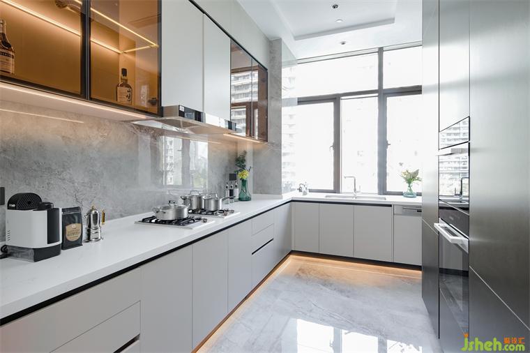 中厨配置了L型的厨柜既保证了操作面的同时也增加了很多收纳功能。简练烤漆饰面为厨房带来干净利落质感,暗藏内嵌的设备,样板房设计将功能与美观完美结合,以心思布之各得其位,由器及道,感受着食材搭配之妙趣。这是对家的具象表达,真实且幸福。