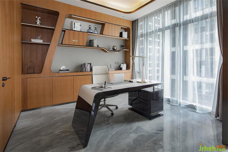 书房书柜不规则几何元素增加一抹趣味性,即是书架也是展示柜,横纵交错的线条和体块,丰富空间功能属性的同时,赋予空间内敛而温润的优雅气质。