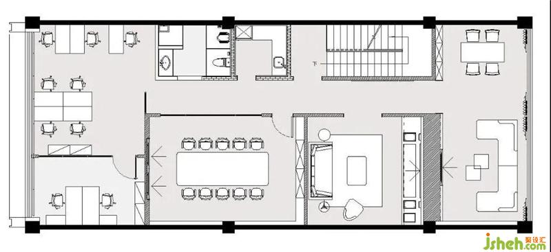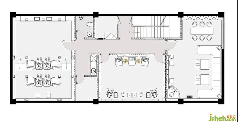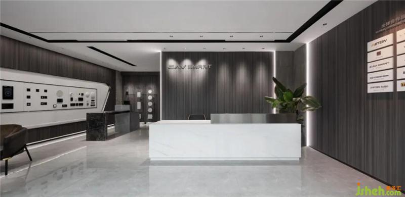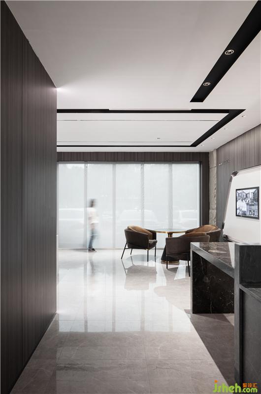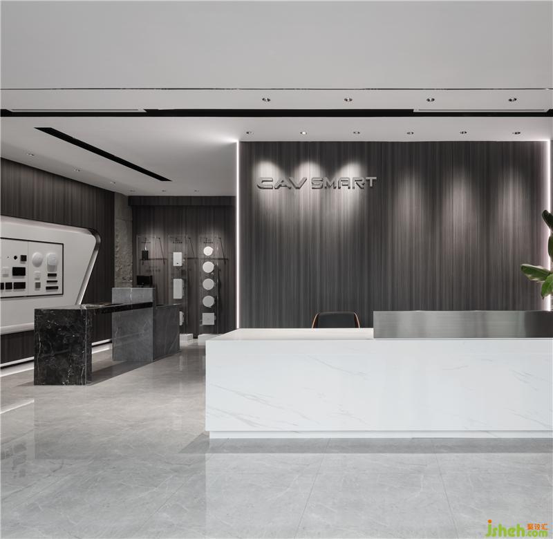 首先最重要的开始,应该是LOGO背景墙。两边暗藏灯带,从地面一直延伸至天花,起到延伸感。从前台一步步牵引,开阔明亮,装修设计摒弃主灯带来的压抑,在没有主灯的空间里,信息流动通透自然。黑色灯槽平行交错,科技时尚感逐步放射出来。