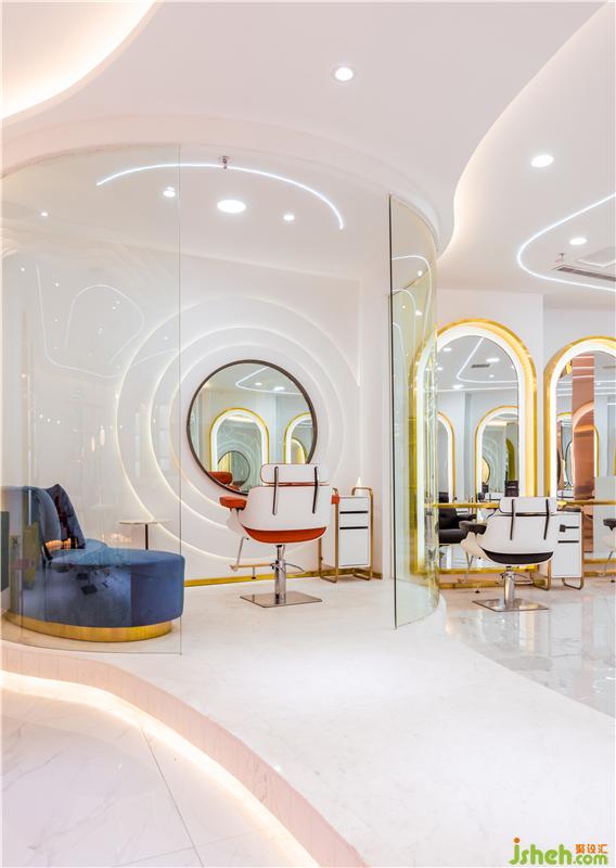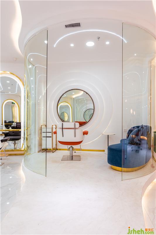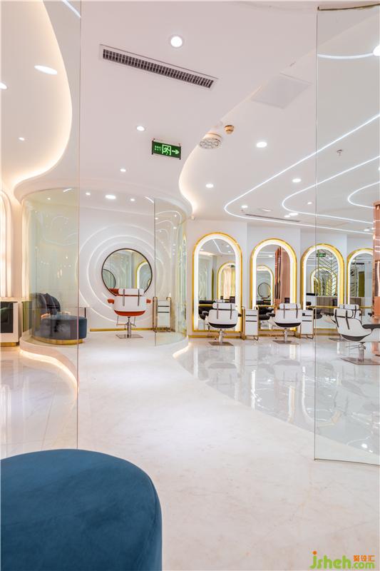 室内为直长型空间,运用白色铺展洁净基调,从视觉上到达空间扩开的效果,顶面配合白色弧形灯带等变化,晶莹穿透延伸空间形态。在空间的部分装修设计采用了玻璃制品作为曲线造型,空间隔而不蔽塞,弱化生硬直白,视觉上自然醒目,分隔形式组成流动的室内空间。