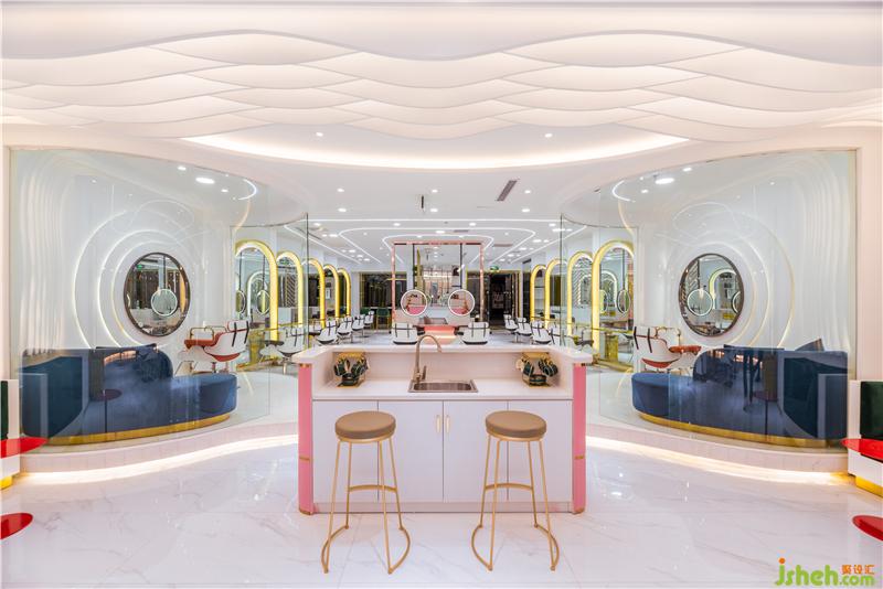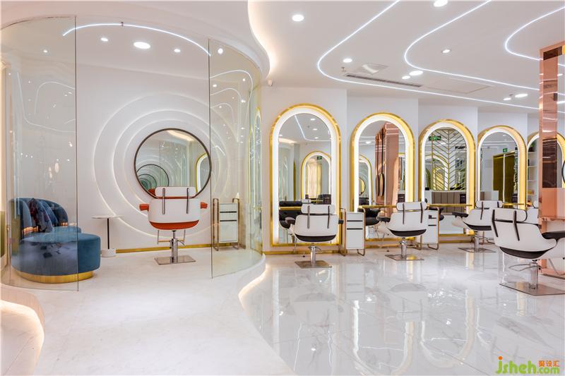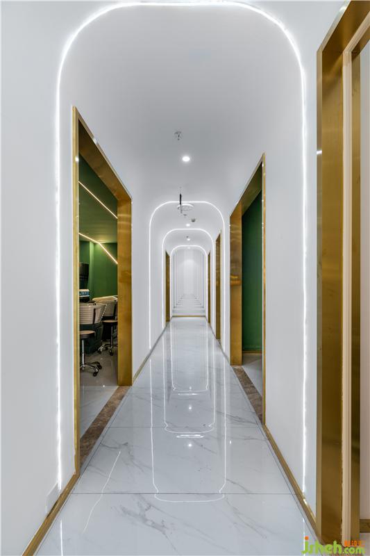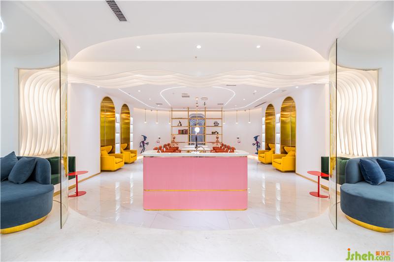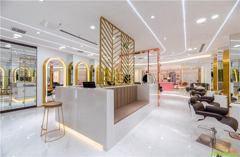 香槟金、黑色不锈钢碰撞出精致迷人,融入玻璃,明快通透。大范围爵士白、纯白石材铺设,散发大气时尚。