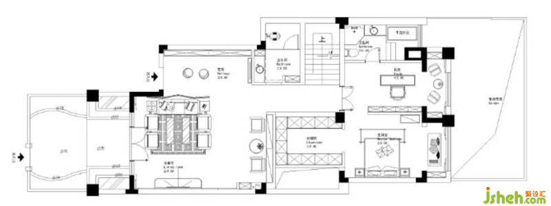 进门玄关处采用实木条案,简约大气,点缀苍劲的松树,将点点的绿意引入室内。大面积实木家具的运用兼具人文气质,搭配简洁硬朗的线条,使整体空间富有层次感,把现代与传统发挥的淋漓尽致。别墅装饰采用木质隔断,让空间具有通透感,灵活性。使各个空间相互呼应,一气呵成。