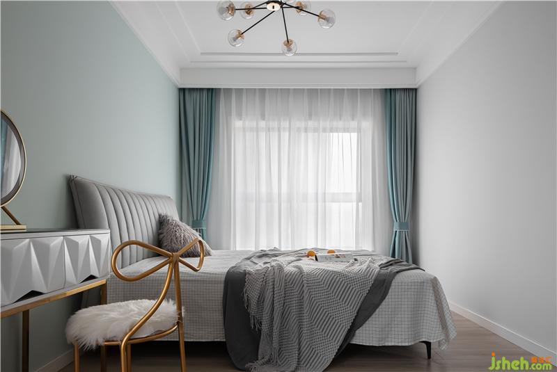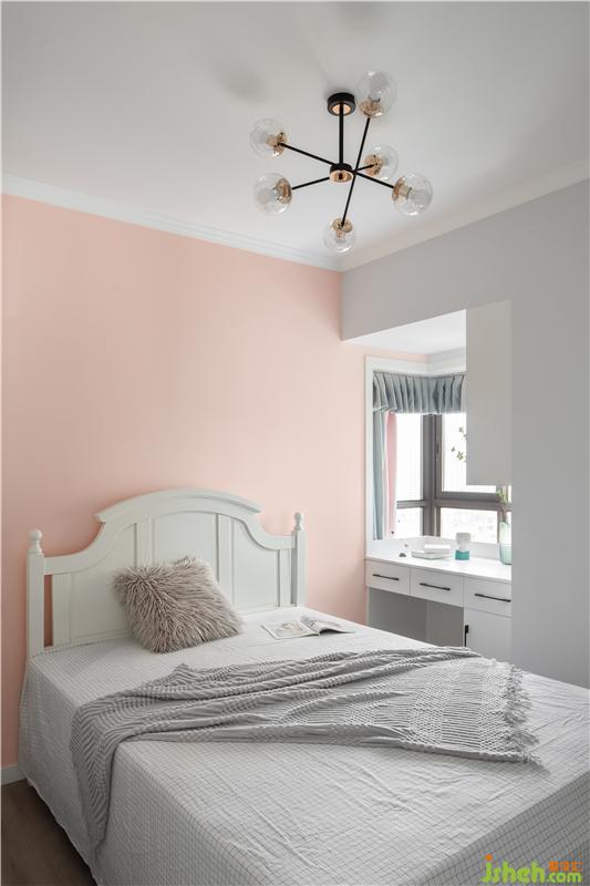 除开主卧,次卧的女儿房在粉色的装饰下,整个房间都显得温馨可爱。另一间蓝色+粉色的窗帘,也为单调的房间增添了一抹趣味。